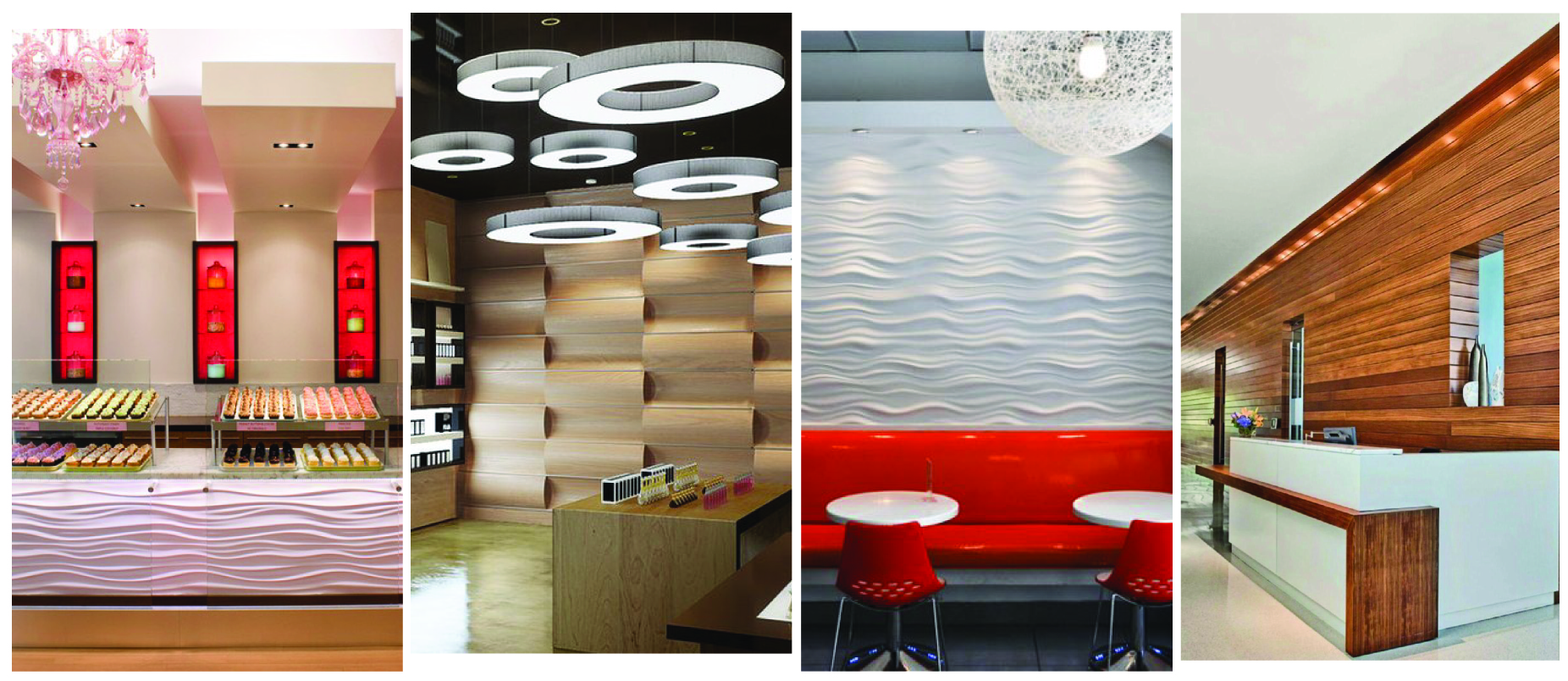 As artisan craft has given way to machine-made aesthetic, designers have embraced texture as a way to create visual interest. This new ornament including horizontal wood patterns and white wave textures are this year’s exploding trends. While these trends have been gaining momentum over the last several years in venues such as Longchamps’ SoHo store and McGraw Hill’s pocket park in mid-town, these trends are exploding with companies such as Modular Arts bringing panelized products to market that designers embrace to create visceral interest in many contexts.